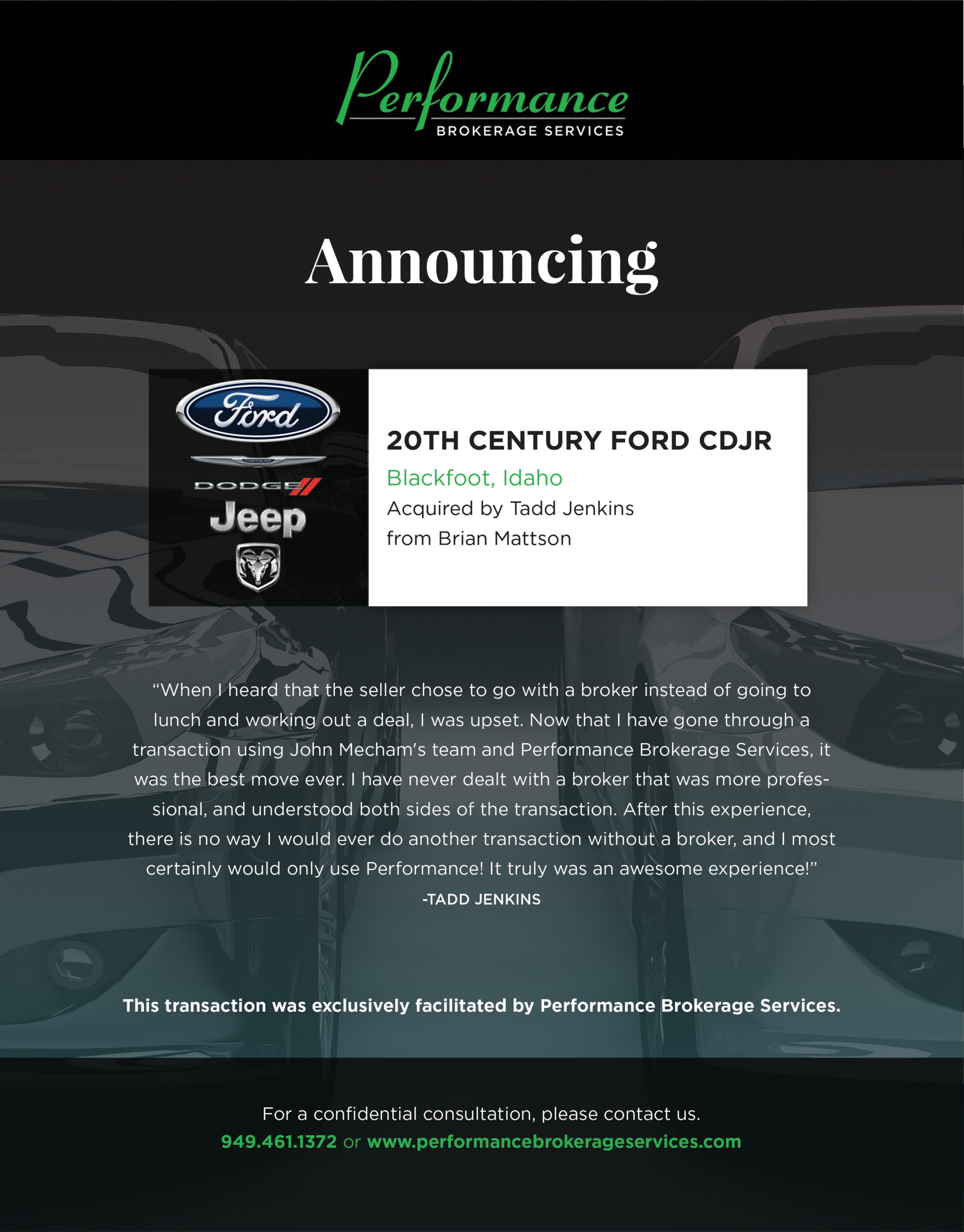Brian Mattson sells 20th Century Ford and Chrysler Dodge Jeep Ram in Blackfoot, Idaho to Tadd Jenkins. This transaction was exclusively facilitated by Performance Brokerage Services, Inc.