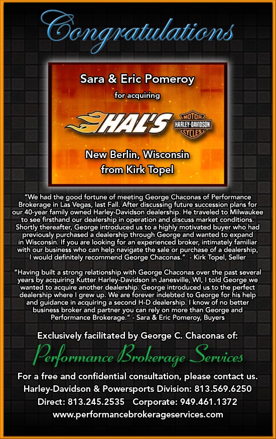 Kirk Topel sells Hal’s Harley-Davidson in New Berlin, Wisconsin to Eric and Sara Pomeroy. Eric Pomeroy grew up in the area. He and Sara also own and operate Boardtrackers Harley-Davidson in Janesville and Swiss Valley Harley-Davidson in Monroe, Wisconsin. This transaction was exclusively facilitated by Performance Brokerage Services, Inc.