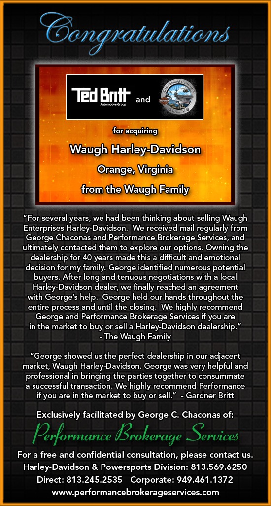 For several years, we had been thinking about selling Waugh Enterprises Harley-Davidson. We received mail regularly from George Chaconas and Performance Brokerage Services, and ultimately contacted them to explore our options. Owning the dealership for 40 years made this a difficult and emotional decision for my family. George identified numerous potential buyers. After long and tenuous negotiations with a local Harley-Davidson dealer, we finally reached an agreement with George’s help. George held our hands throughout the entire process and until the closing. We highly recommend George and Performance Brokerage Services if you are in the market to buy or sell a Harley-Davidson dealership.