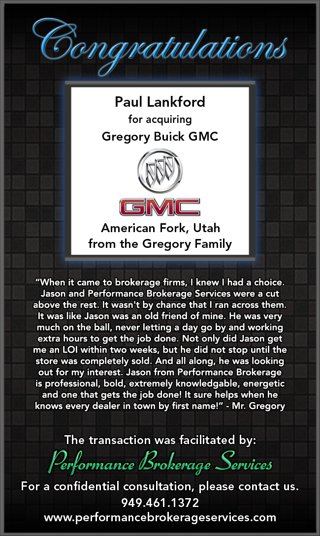 Automotive Announcing the Sale of a Buick GMC Dealership in UtahOctober 10, 2011 Buick GMC of American Fork, Utah