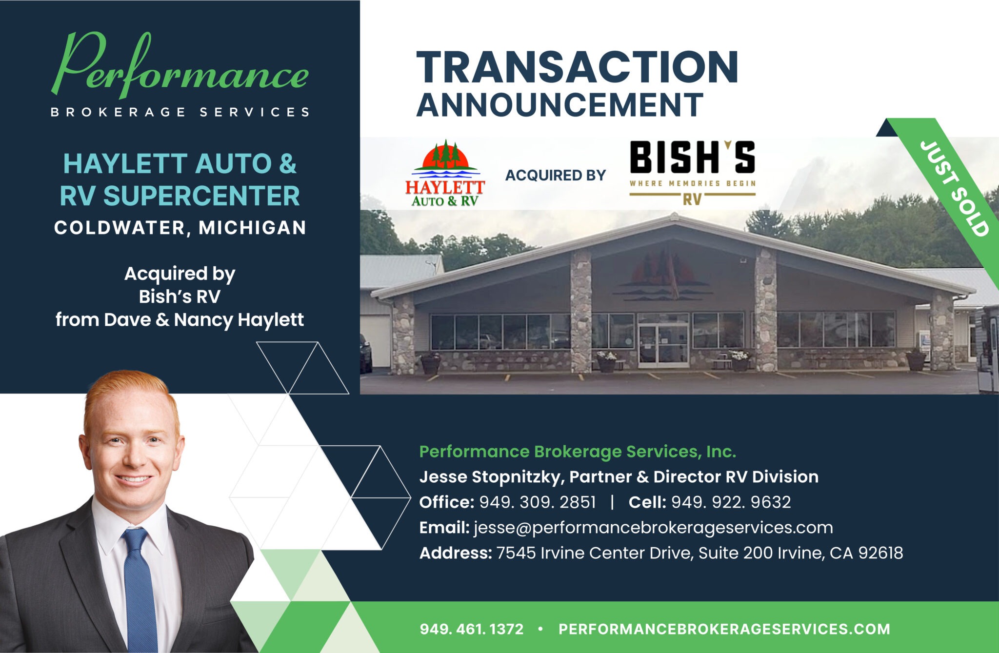 Following the sale, Haylett commented, “After interviewing a few brokers, based on our discussions and our concerns, we really felt there was only one choice for us. That choice was Jesse Stopnitzky and Performance Brokerage Services, who have sold over 700 dealerships across the country and are family-owned with tons of experience. It was refreshing to find a broker that really listened and understood our concerns and what we were trying to accomplish. Jesse was very helpful in designing a plan that fit all our needs for our family, employees, and community. Jesse truly demonstrated honesty and integrity throughout every step of the process and hit all the marks in matching us with the right buyer. He found likeminded people that had the same care that we had, another family value-based group, Bish’s RV. He also helped make our transition as seamless as possible. I highly recommend Jesse Stopnitzky and his family at Performance Brokerage Services to anyone considering selling their RV dealership.”