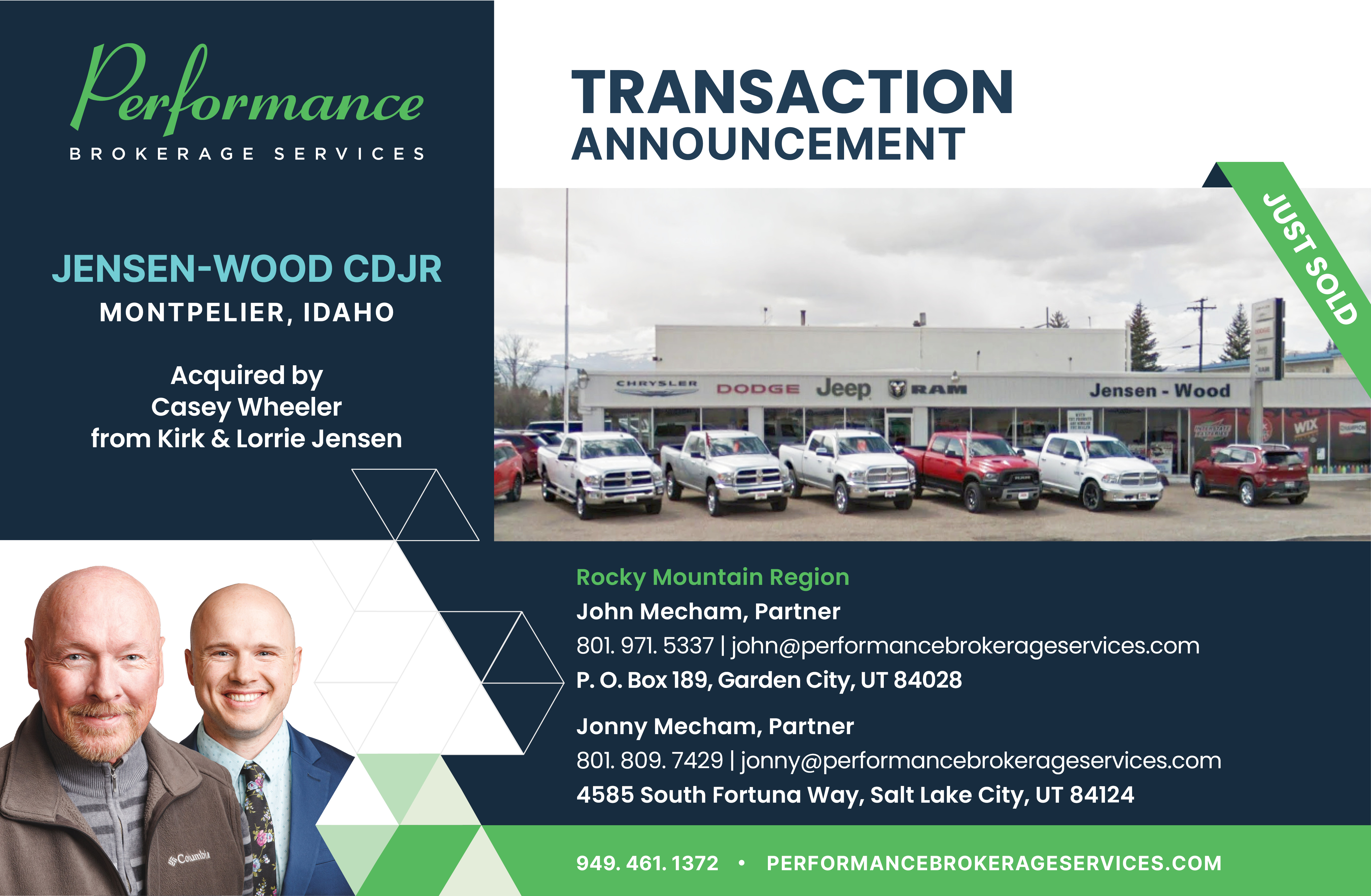 Performance Brokerage Services, the leader in dealership buy-sell activity, announces the sale of Jensen-Wood Chrysler Dodge Jeep Ram of Montpelier, Idaho from Kirk & Lorrie Jensen to Casey Wheeler.