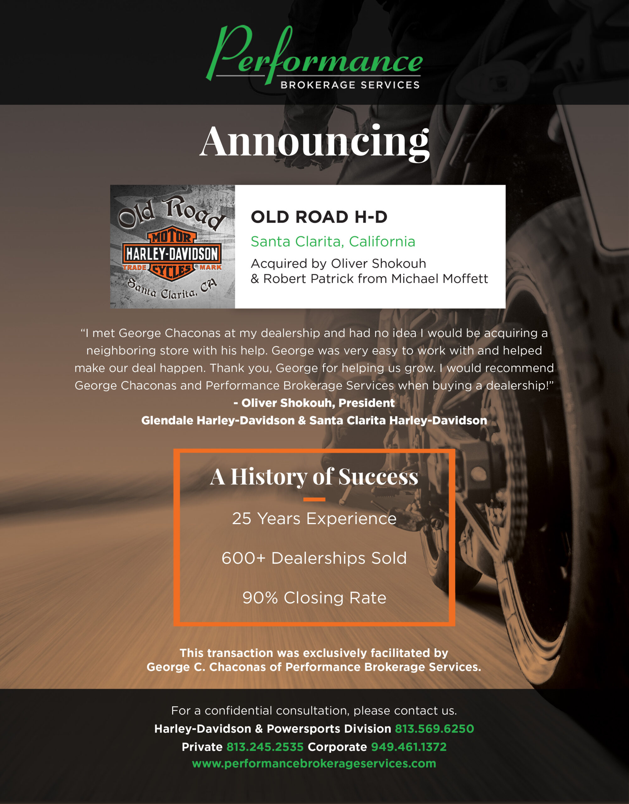 Oliver Shokouh and Robert Patrick acquire Old Road Harley-Davidson in Santa Clarita, California from Michael Moffett. This transaction was exclusively…