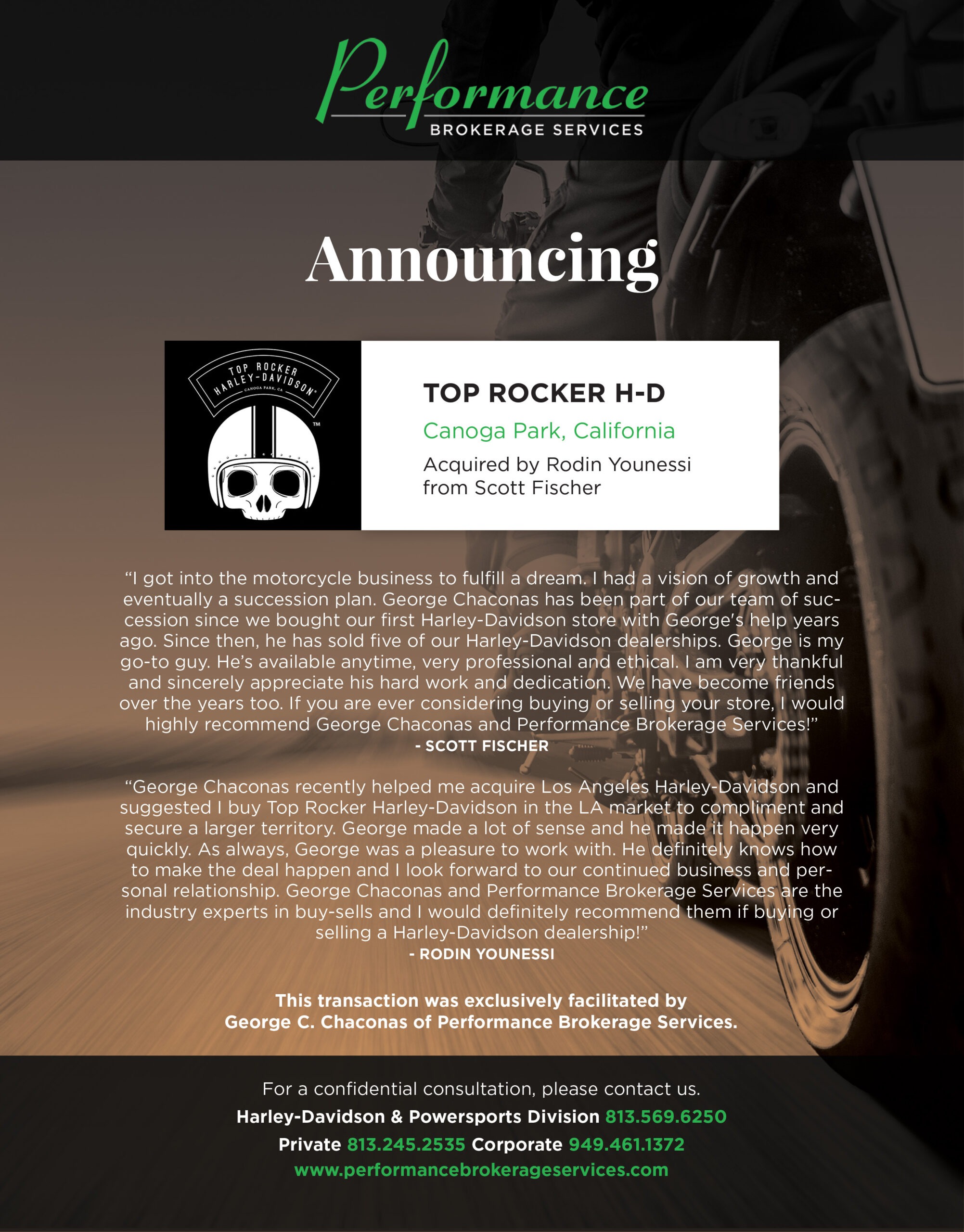 Scott Fischer sells Top Rocker Harley-Davidson in Canoga Park, California to Rodin Younessi. Younessi recently purchased Los Angeles Harley-Davidson of…