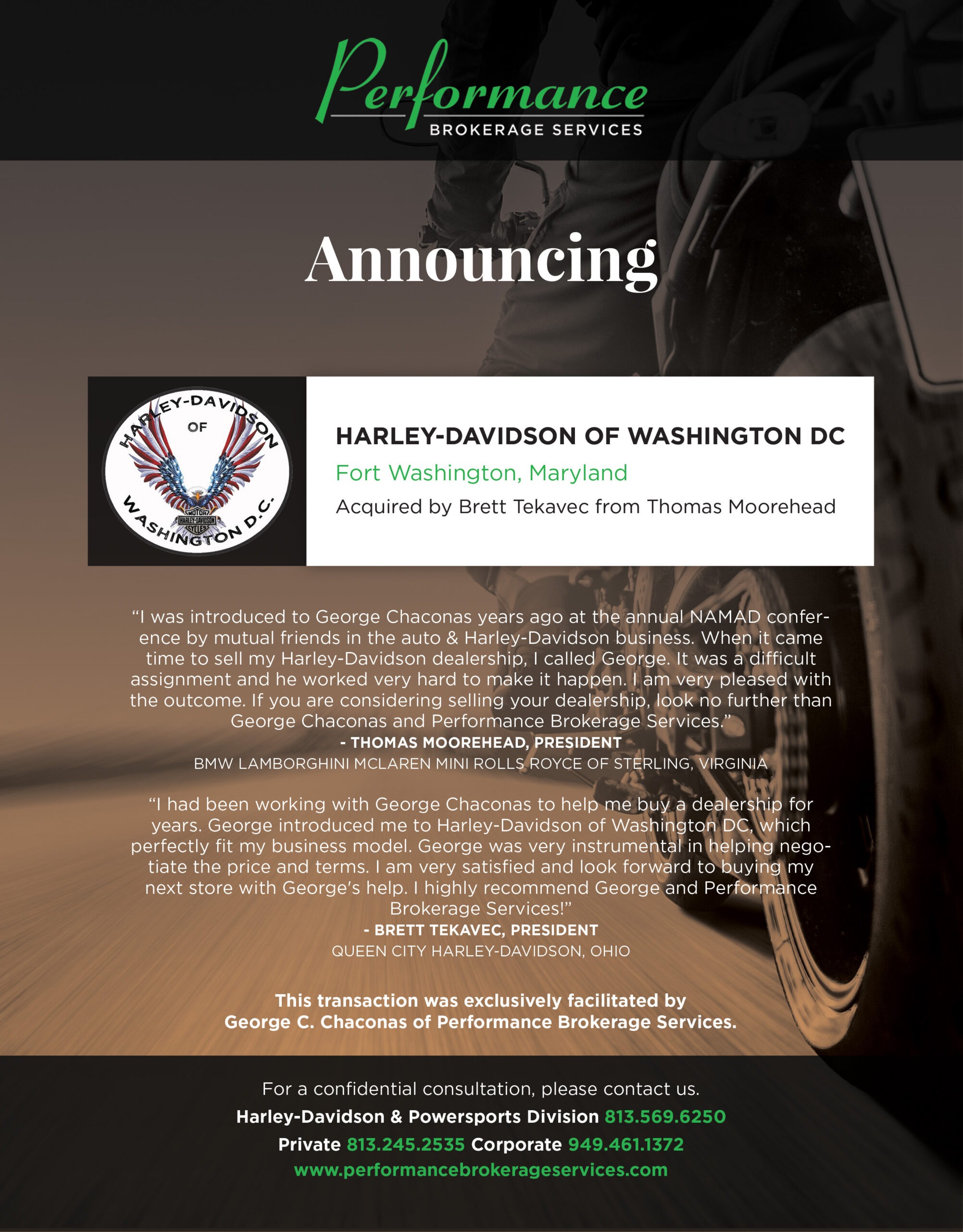 Thomas Moorehead, President of BMW Lmaborghini McLaren Mini Rolls Royce of Sterling, Virginia, sells Harley-Davidson of Washington DC in Fort…