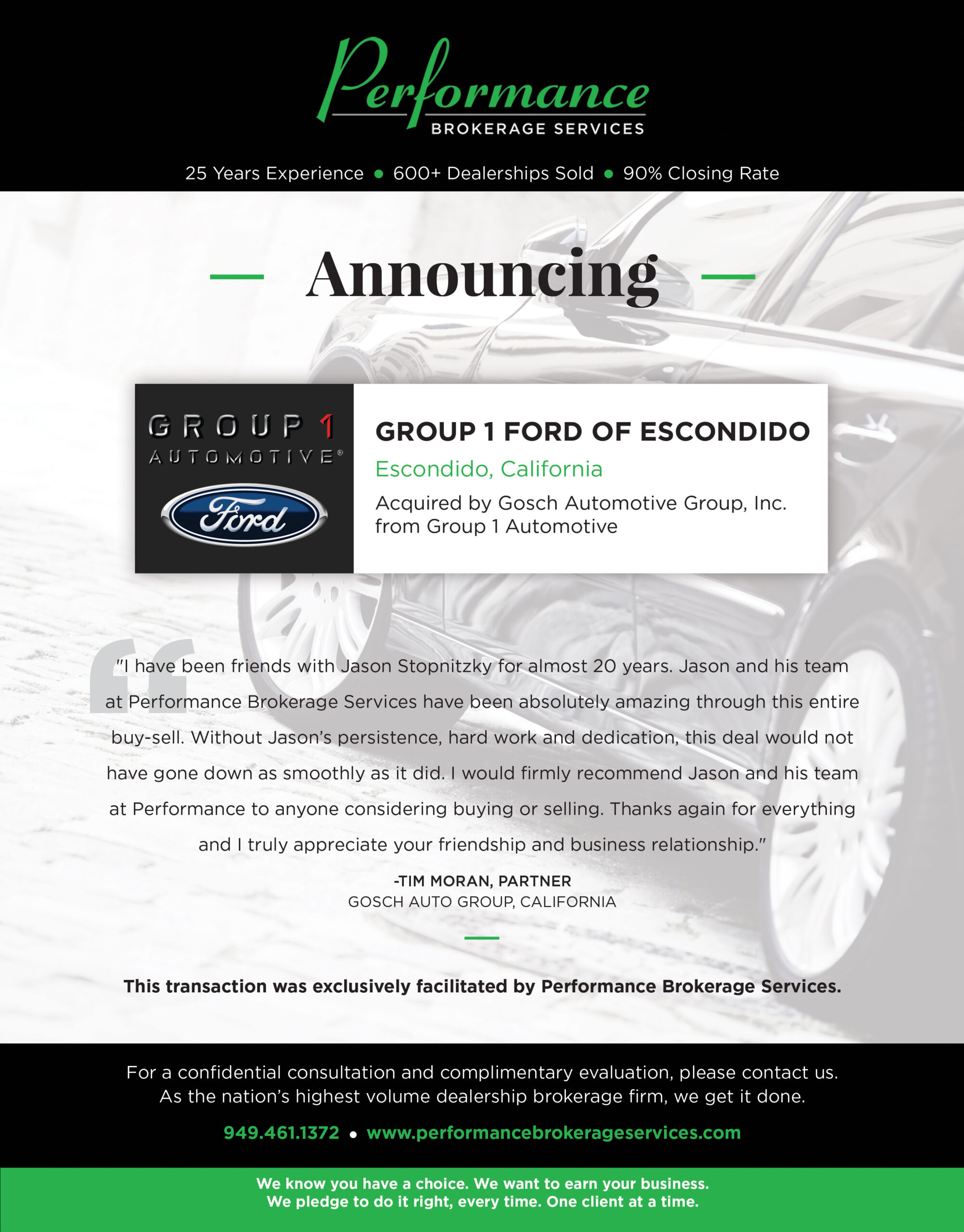 Group 1 Automotive, one of the nation’s largest automotive companies, sold Ford of Escondido to Gosch Auto Group. This transaction…