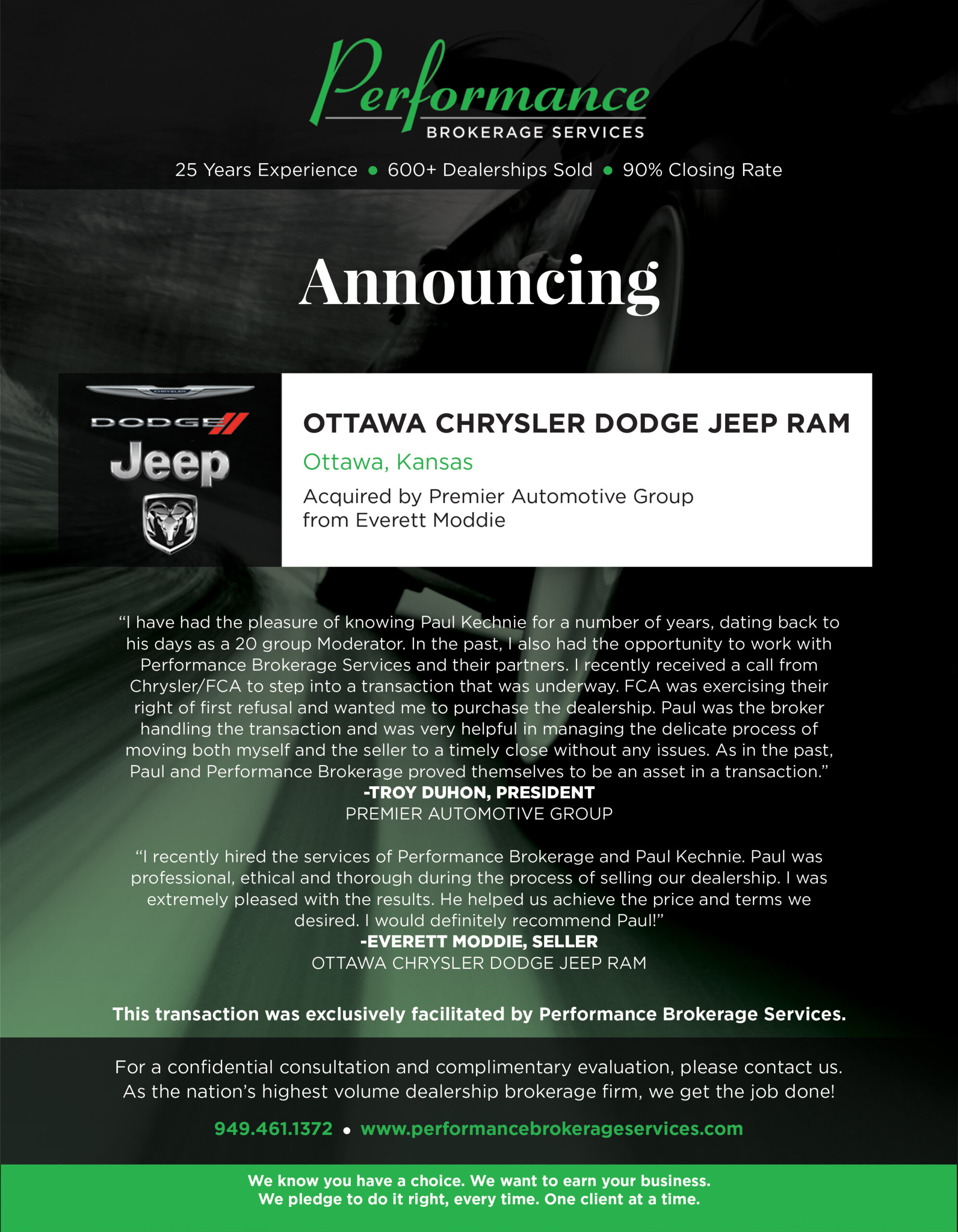 Troy Duhon and Eric Gentry of Premier Automotive Group acquire Ottawa Chrysler Dodge Jeep Ram in Ottawa, Kansas from Everett…