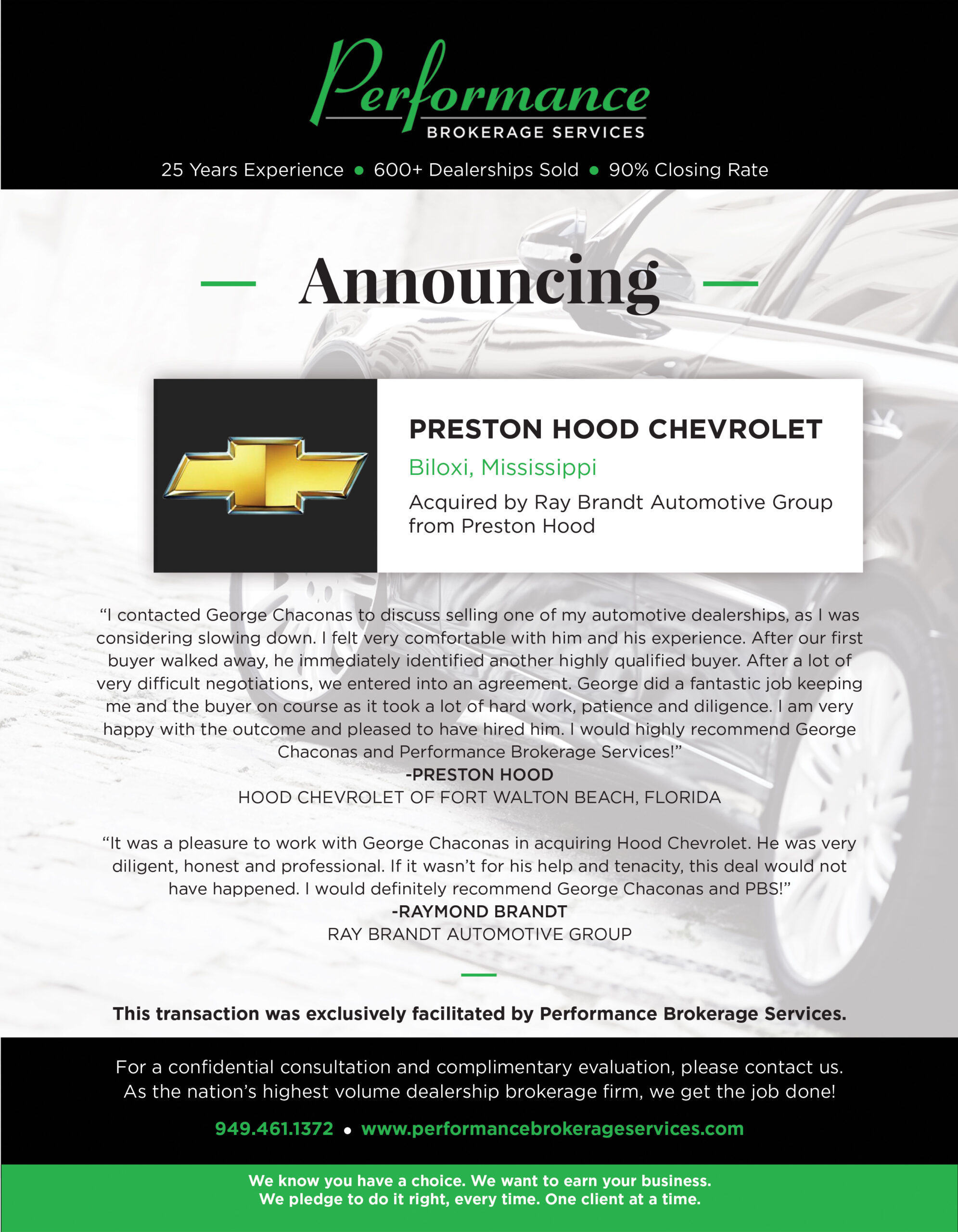 Ray Brandt Automotive Group acquires Preston Hood Chevrolet in Biloxi, Mississippi from Preston Hood. This was a perfect strategic acquisition…