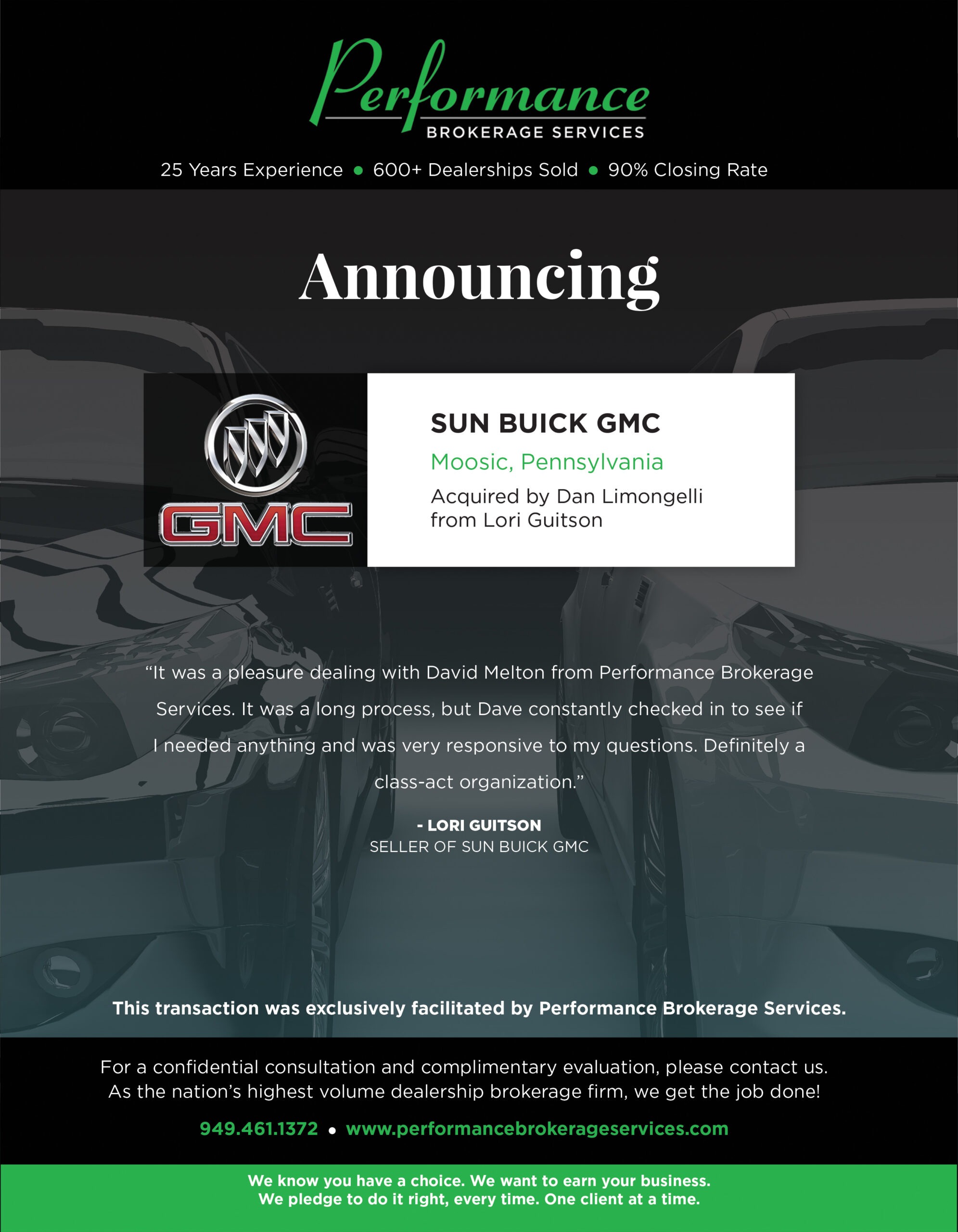 Lori Guitson sells Sun Buick GMC in Moosic, Pennsylvania to first-time buyer and independent dealer, Dan Limongelli. This transaction was…