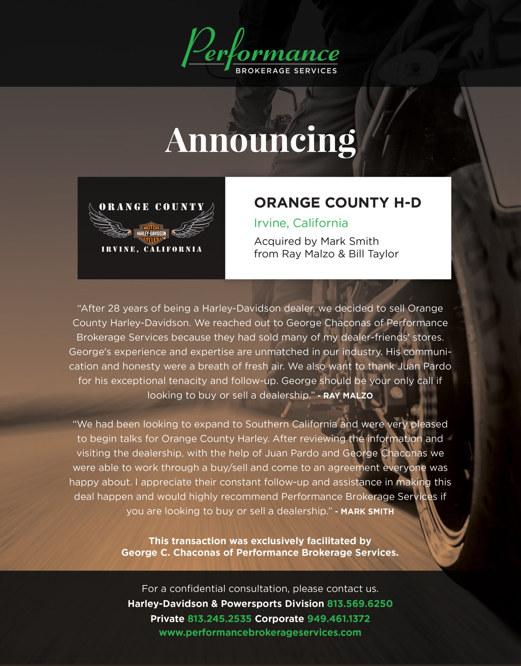 After 28 years of ownership, Ray Malzo and Bill Taylor have sold the iconic Orange County Harley-Davidson in Irvine, California…