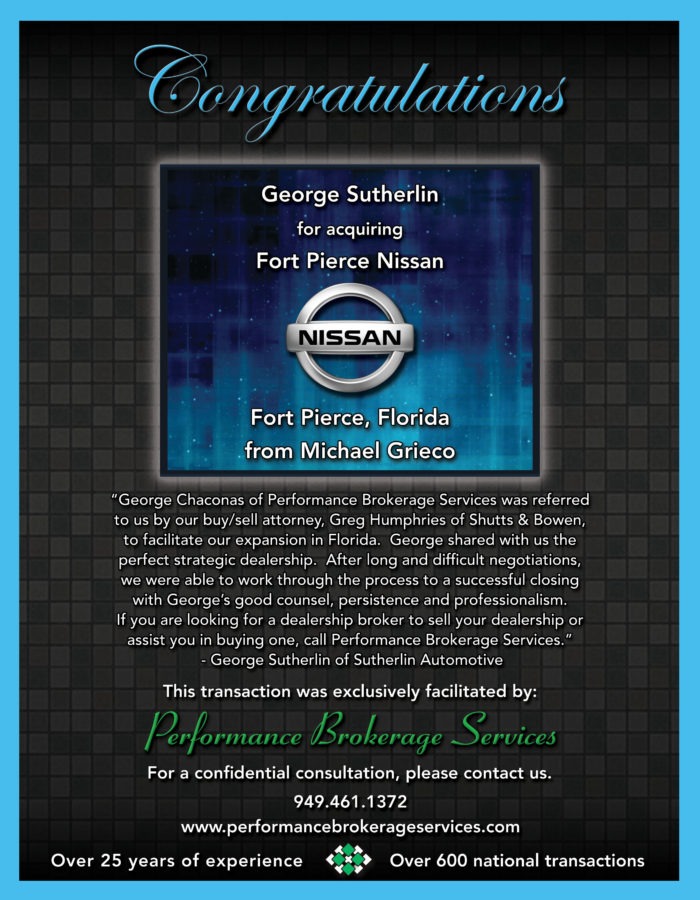 Performance Brokerage Services, Inc. announces the sale and purchase of Nissan of Fort Pierce, Florida from Michael Grieco to George…