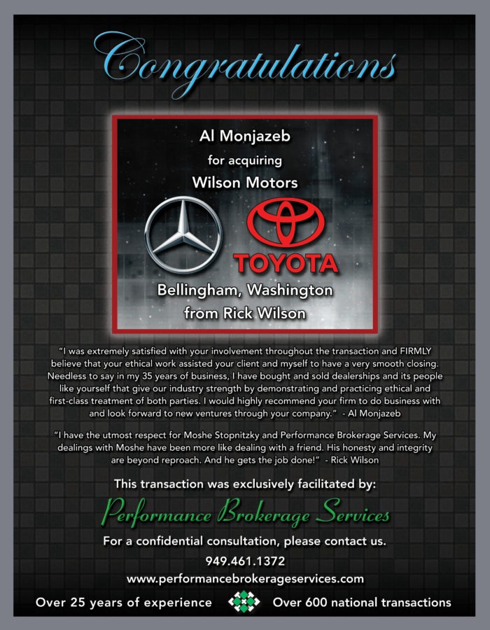 Mr. Al Monjazeb buys Wilson Motors featuring Mercedes-Benz and Toyota in Bellingham, Washington from Mr. Rick Wilson. This transaction was…