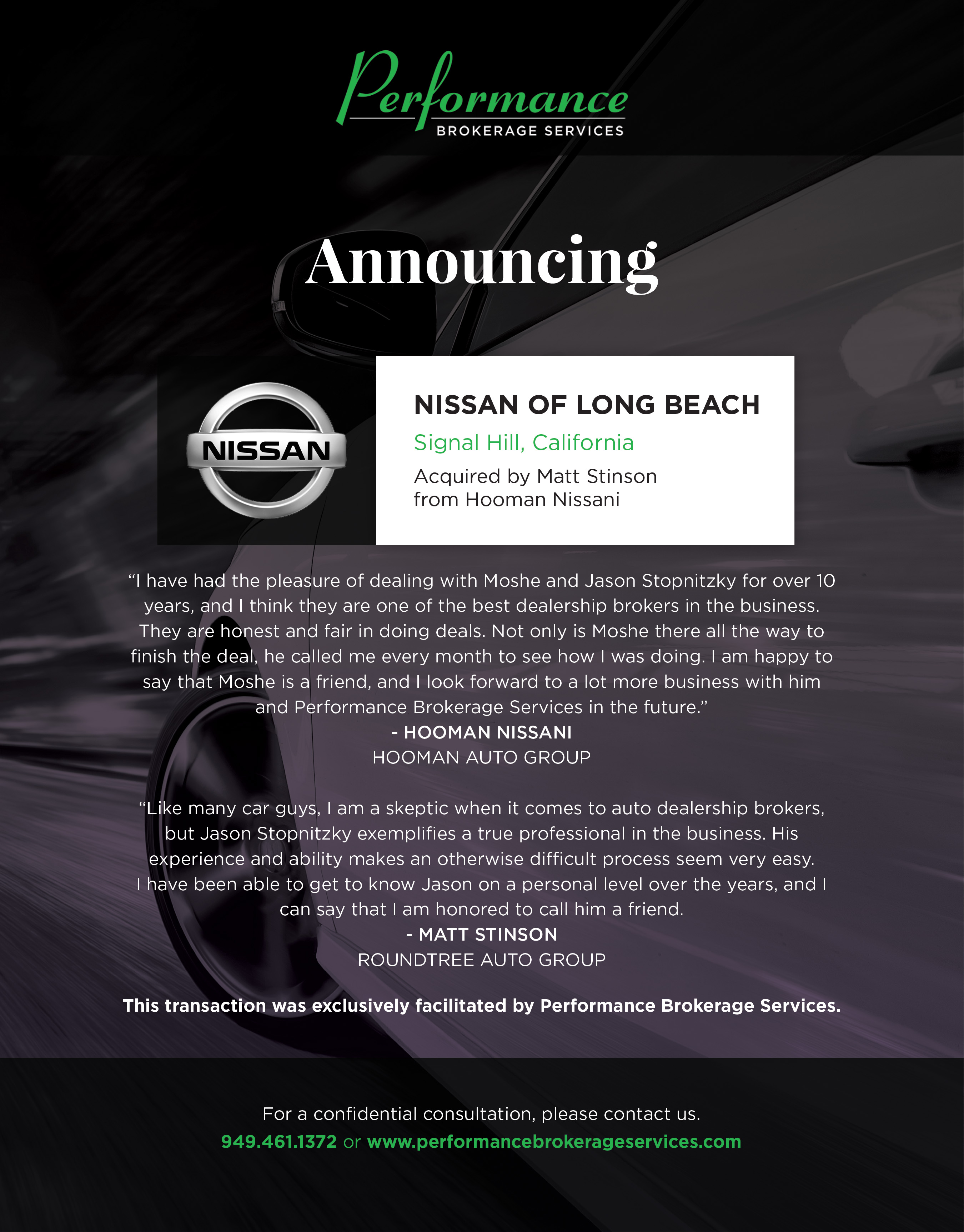 Performance Brokerage Services, Inc. announces the sale and purchase of Nissan of Long Beach by Matt Stinson and Roundtreee Automotive…