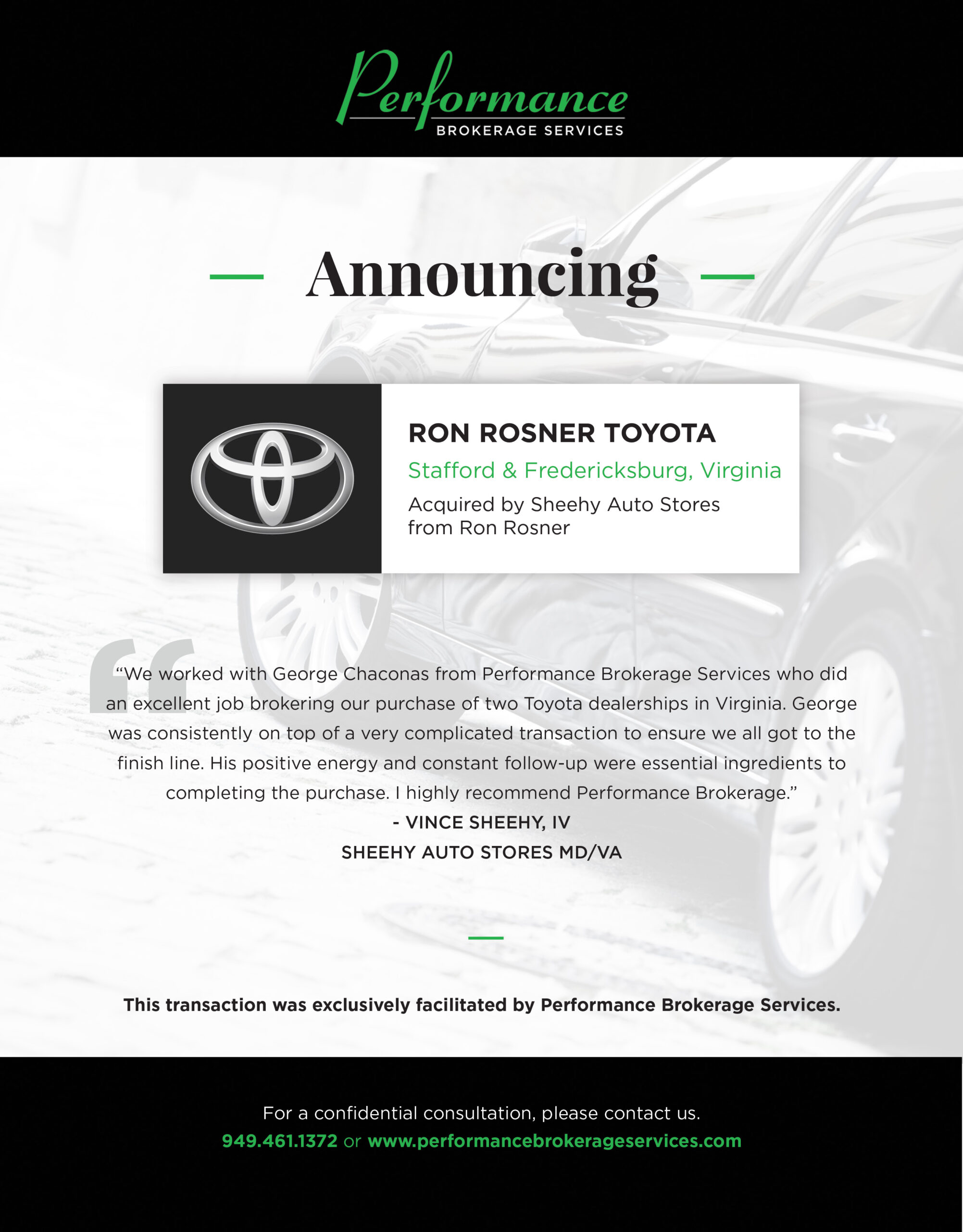 Performance Brokerage Services, Inc. announces the purchase and sale of 2 Toyota dealerships in Fredericksburg and Stafford, Virginia from Ron…