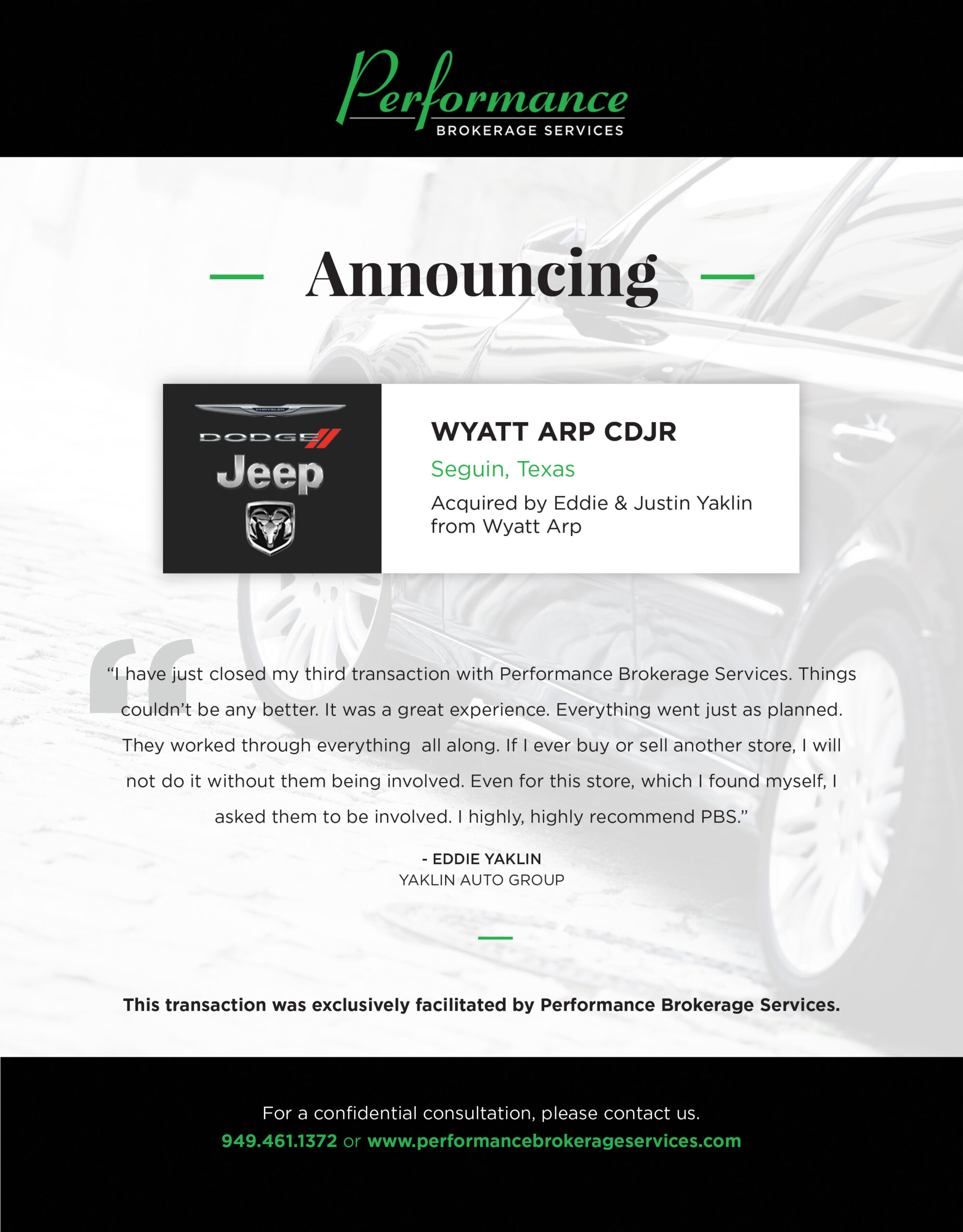 Wyatt Arp sells Chrysler Dodge Jeep Ram of Seguin, Texas to Eddie and Justin Yaklin. This transaction was exclusively facilitated…