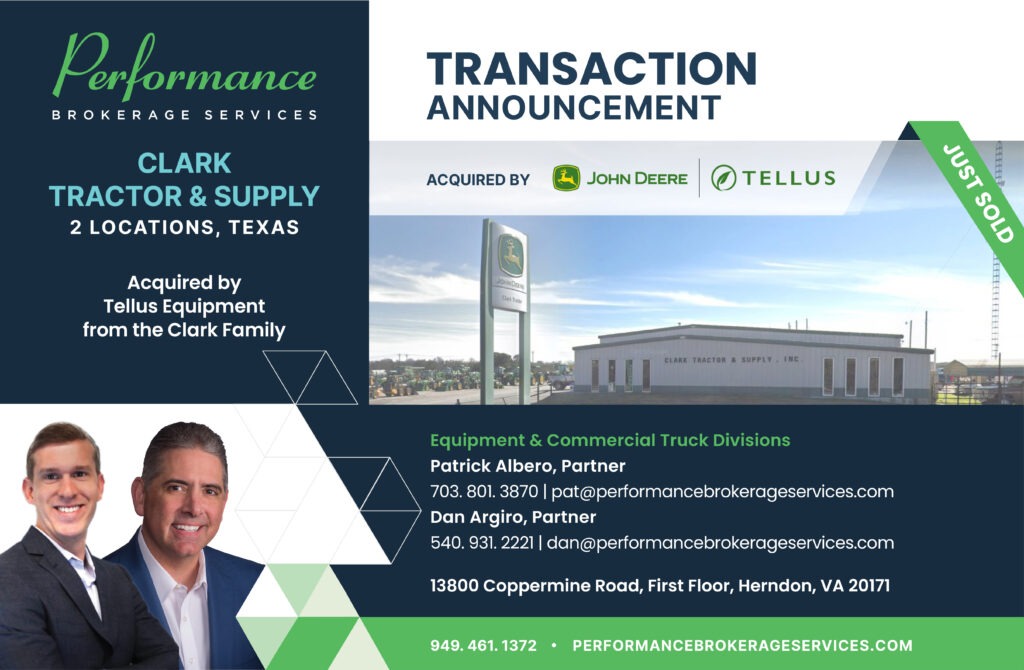 Performance Brokerage Services, the leader in dealership buy-sell activity, announces the sale of Clark Tractor and Supply in Comanche and…