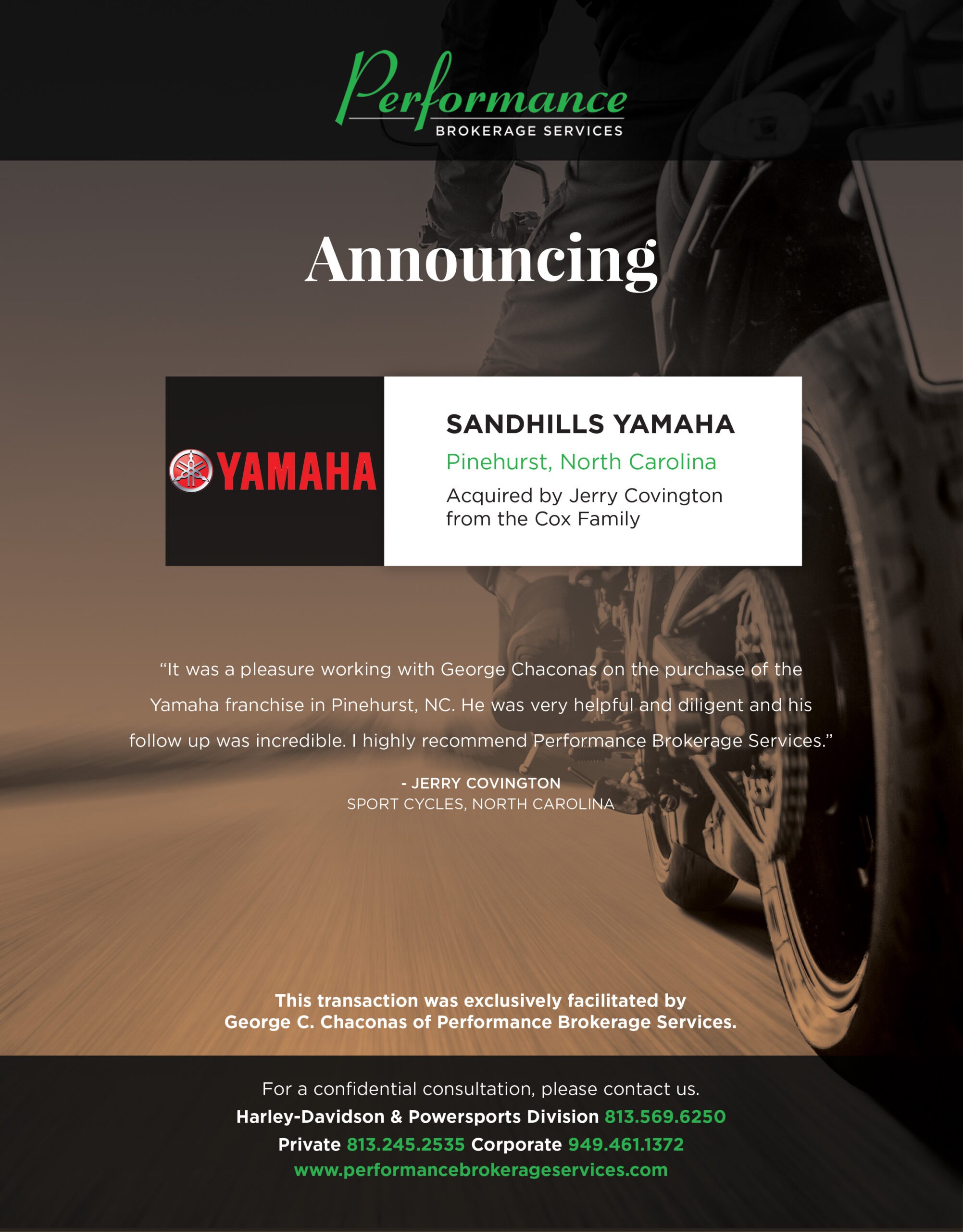 Jerry and Keith Covington acquired Sandhills Yamaha in Pinehurst, North Carolina and relocated the franchise to their Sport Cycles dealership in Rockingham, NC. The sellers were the Cox family who owned and operated the dealership for over 45 years. This transaction was exclusively facilitated by Performance Brokerage Services, Inc.