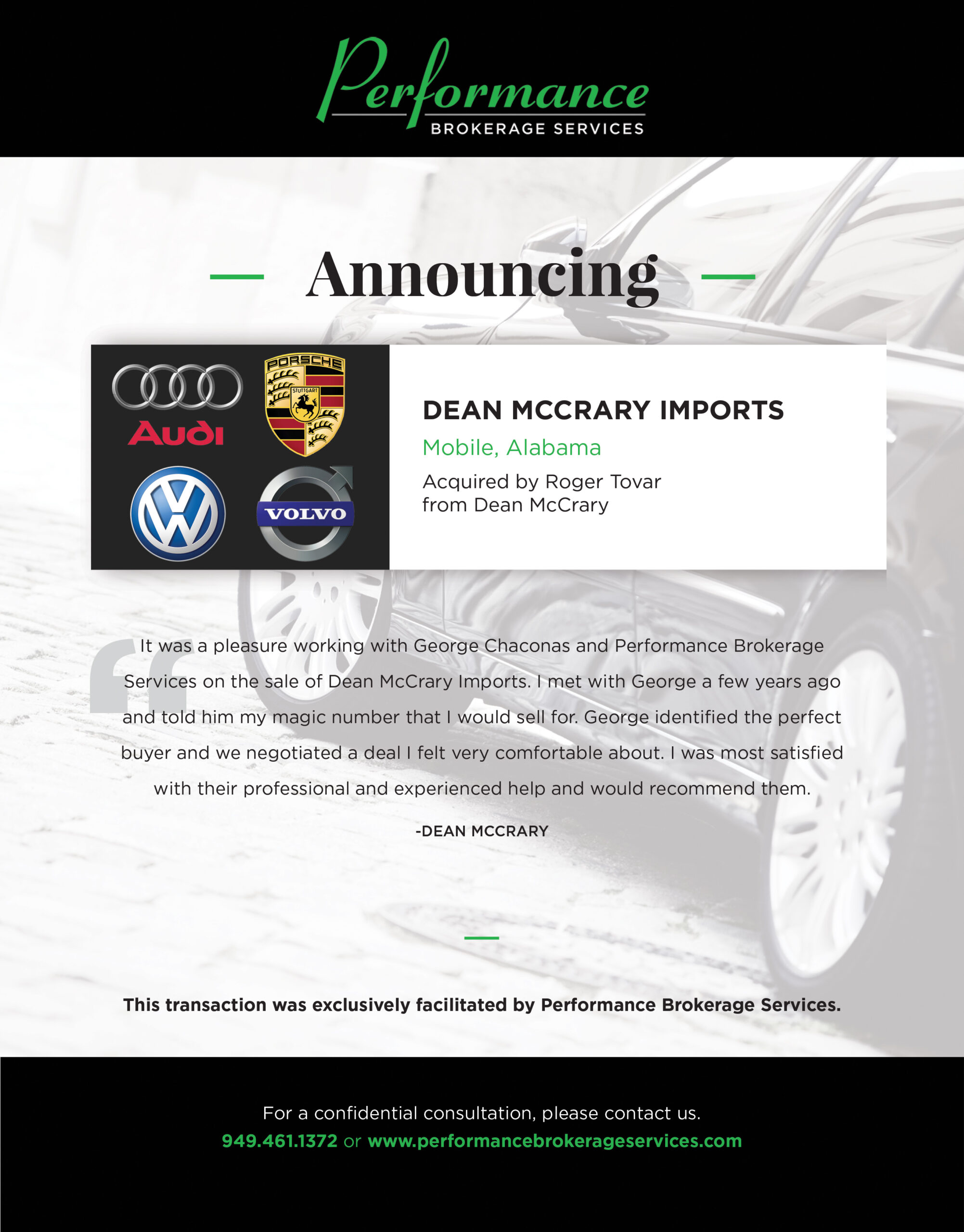 Dean McCrary sells Dean McCrary Imports offering Audi, Porsche, Volkswagen and Volvo in Mobile, Alabama to Roger Tovar. This transaction was exclusively facilitated by Performance Brokerage Services, the nation’s highest volume dealership brokerage firm.