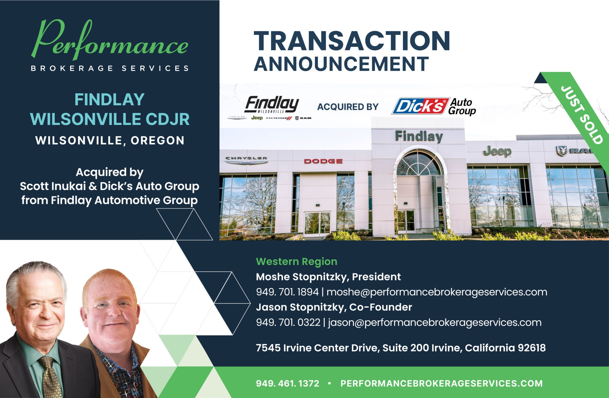 Performance Brokerage Services is pleased to announce the sale of Findlay Wilsonville CDJR in Wilsonville, Oregon from Findlay Automotive Group to Scott Inukai and Dick’s Automotive Group. This transaction was exclusively facilitated by Moshe Stopnitzky, President and Jason Stopnitzky, Co-Founder of Performance Brokerage Services.