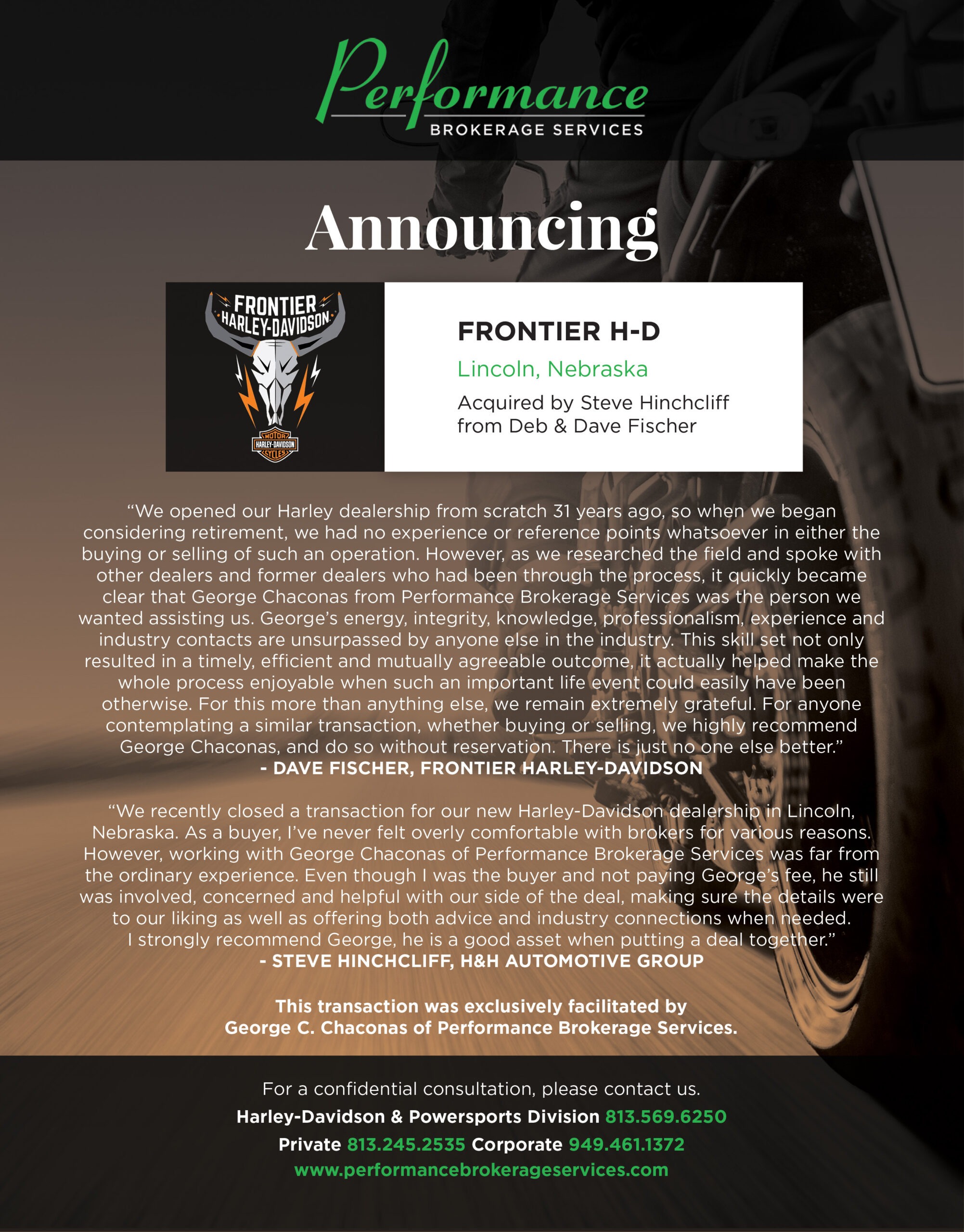 George C. Chaconas, the exclusive agent for this transaction and the head of the National Harley-Davidson and Powersports Division for Performance Brokerage Services commented, “What a perfect fit for Steve Hinchcliff to acquire Frontier Harley-Davidson in his own backyard. It brings me tremendous pleasure to have assisted with this transaction and to allow Deb and Dave Fischer to enjoy their retirement.”