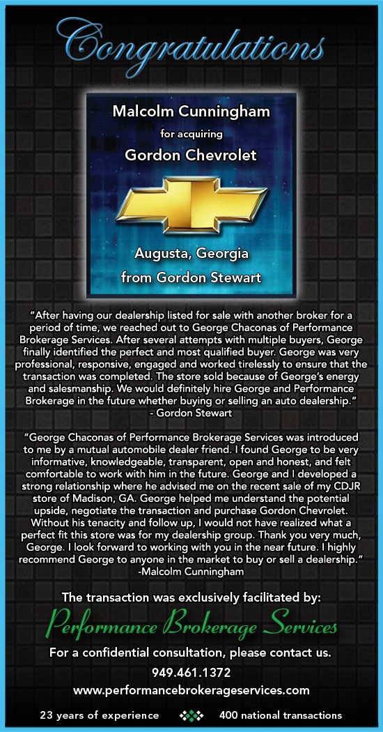 Gordon Stewart sells his Chevrolet dealership in Augusta, Georgia to Malcolm Cunningham. This transaction was exclusively facilitated by George C. Chaconas of Performance Brokerage Services.
