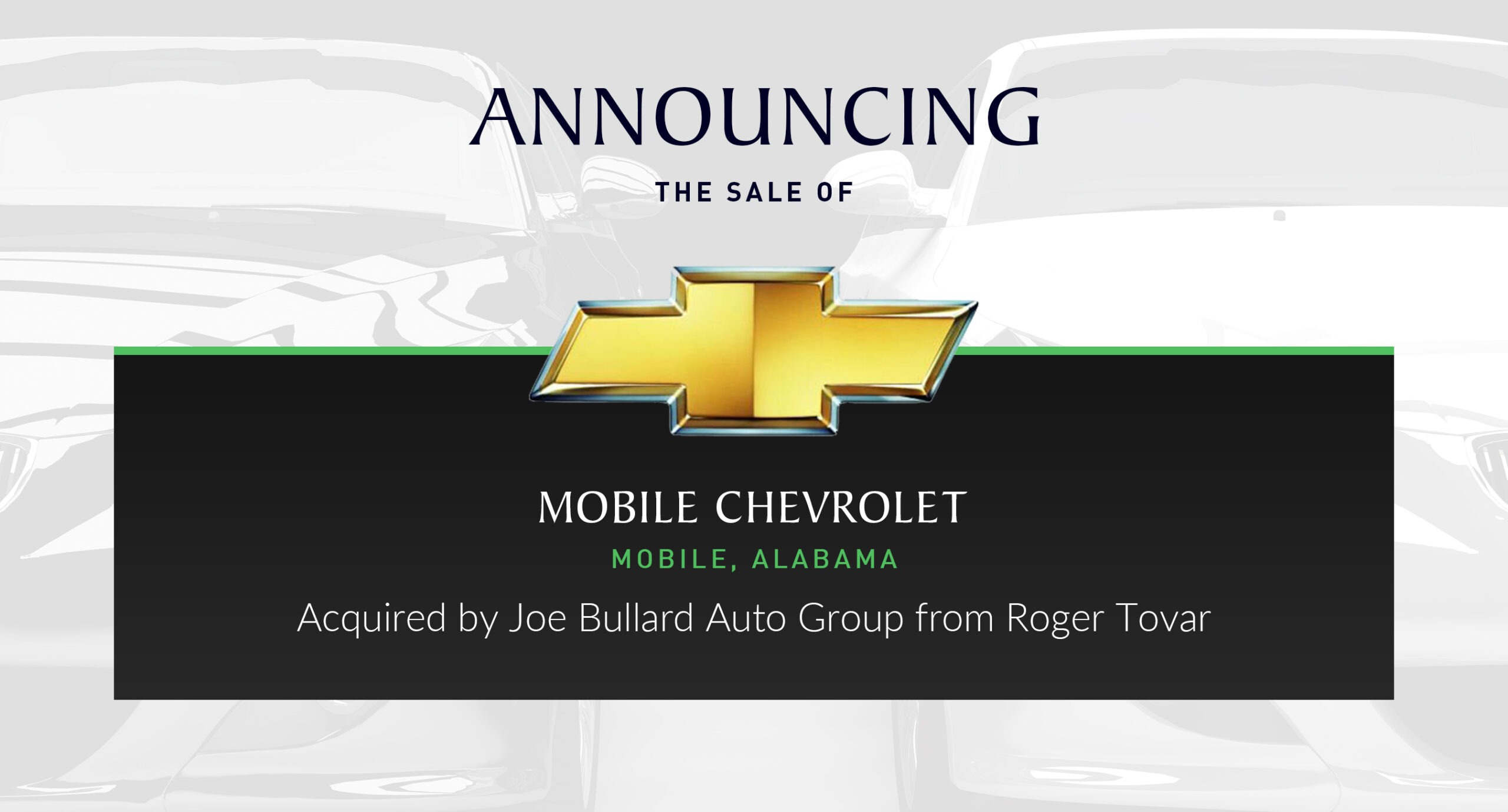 Over the last 5 years, Performance Brokerage Services has represented for sale over 200 automotive dealerships making it the highest volume automotive dealership brokerage firm in North America. George C. Chaconas, the exclusive advisor for this transaction and the Southeast Partner for Performance Brokerage Services commented, “It was an honor and privilege to represent Mr. Tovar on the sale of Mobile Chevrolet after exclusively representing him on other dealership acquisitions. It was extremely exciting helping Ty buy his first dealership for the Joe Bullard Automotive Group. We look forward to working with Ty in the near future to continue to help grow their family business. I sincerely appreciate and am incredibly grateful for the opportunity to be of service to both the buyer and seller in this transaction.”