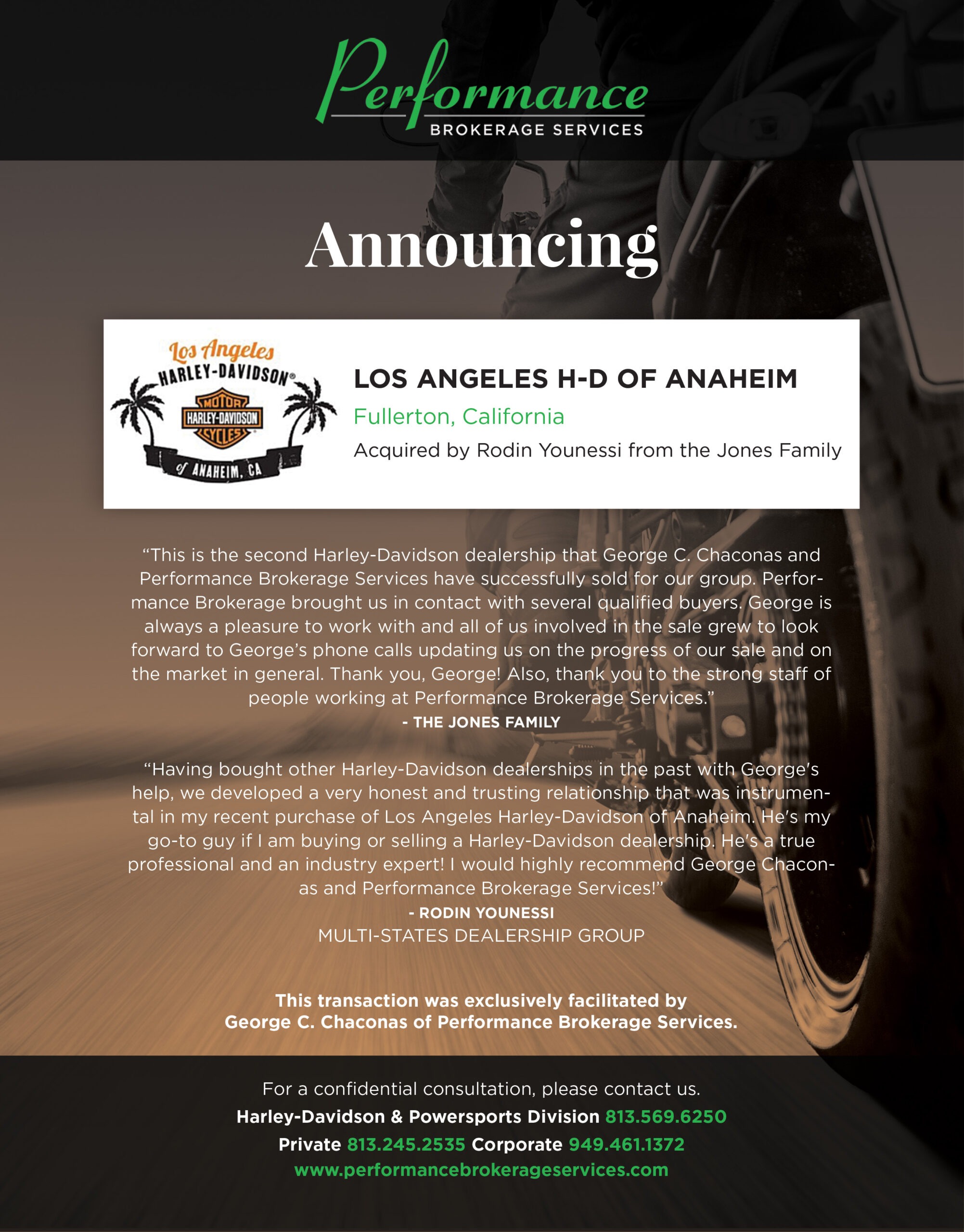 Performance Brokerage Services is pleased to announce the sale of Los Angeles Harley-Davidson of Anaheim in Fullerton, California from the Jones family to Rodin Younessi.