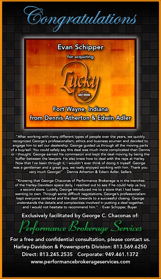 Dennis Atherton and Edwin Adler sold Lucky Harley-Davidson in Fort Wayne, Indiana to Evan Schipper, owner of Bluegrass Harley-Davidson in Louisville, Kentucky. This transaction was exclusively facilitated by Performance Brokerage Services, Inc.