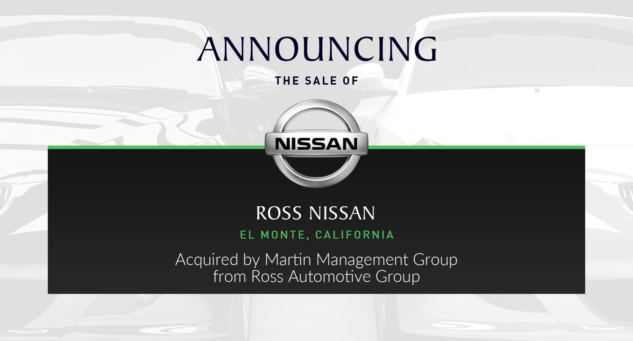 Performance Brokerage Services, a new car dealership broker, advises Ross Automotive Group in the sale of Ross Nissan of El Monte in California to Martin Management Group.