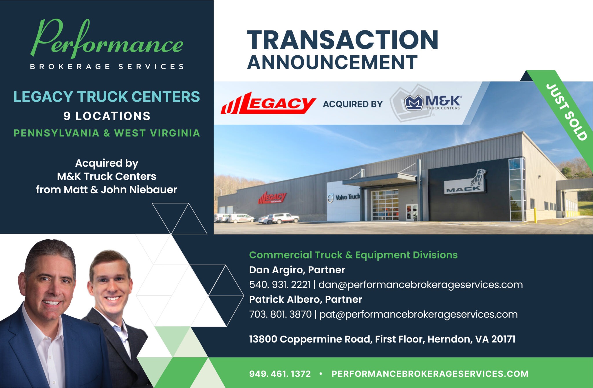 Performance Brokerage Services, North America’s highest volume dealership brokerage firm, is pleased to announce the sale of Legacy Truck Centers, 9 dealership locations in Pennsylvania and West Virginia, from Matt and John Niebauer to M&K Truck Centers.