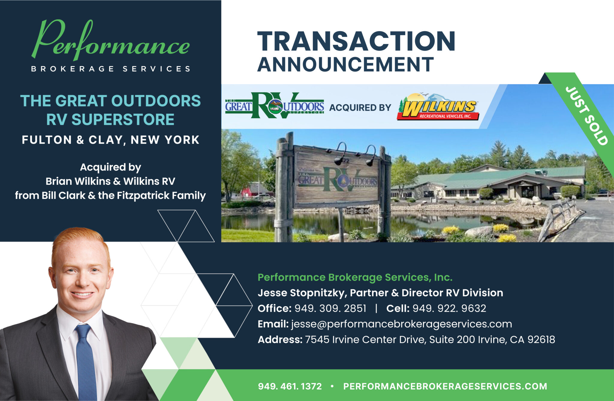 “Finding Jesse Stopnitzky and Performance Brokerage Service was the key to selling my RV dealership,” said Bill Clark, President of The Great Outdoors RV Superstore. “Jesse was vested in a positive outcome from the start and never took his eye off the ball! His expertise brought me a deal within weeks and closed 90 days later. The time he took to get to know my family and me was an added bonus. Jesse’s integrity, perseverance and sense of humor sets him aside from the rest. I highly recommend Jesse Stopnitzky and the Performance team to anyone considering selling or buying in the RV market.”