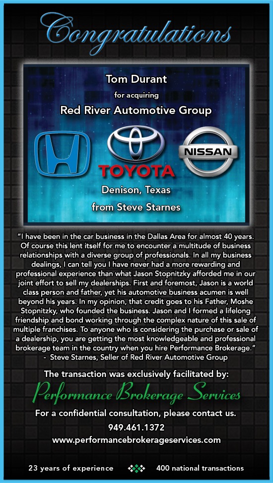Congratulations to Mr. Tom Durant on his recent purchase of Red River Auto Group in Denison, Texas. The auto group features three beautiful and state of the art facilities side by side offering the Toyota, Honda and Nissan franchises. We wish to thank our dear friend Steve Starnes for the opportunity to be of service and to represent him in the market place, and wish Tom Durant success with his acquisition.
