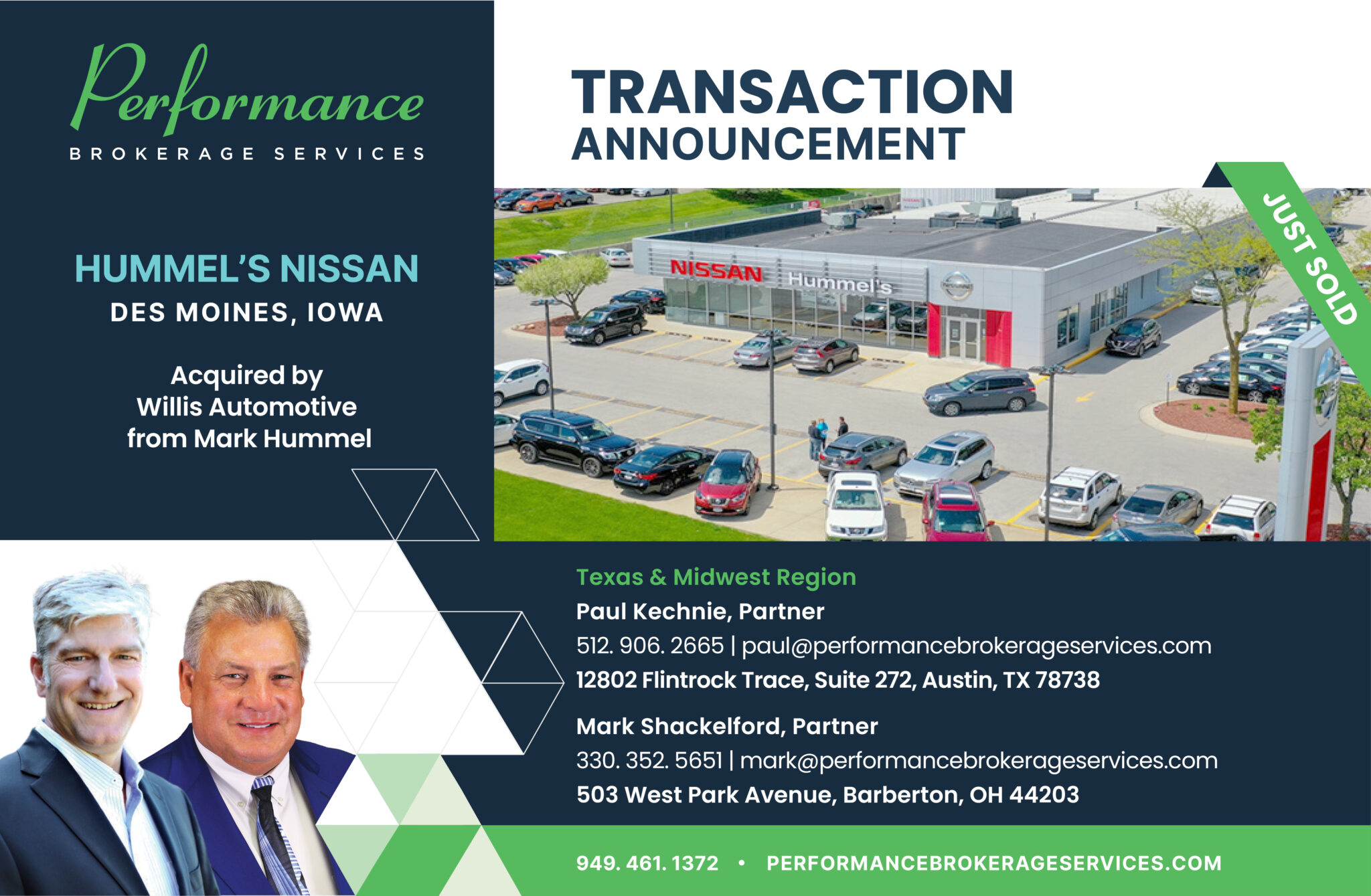 Performance Brokerage Services, North America’s highest volume dealership brokerage firm, is pleased to announce the sale of Hummel’s Nissan of Des Moines, Iowa from Mark Hummel to Willis Automotive.